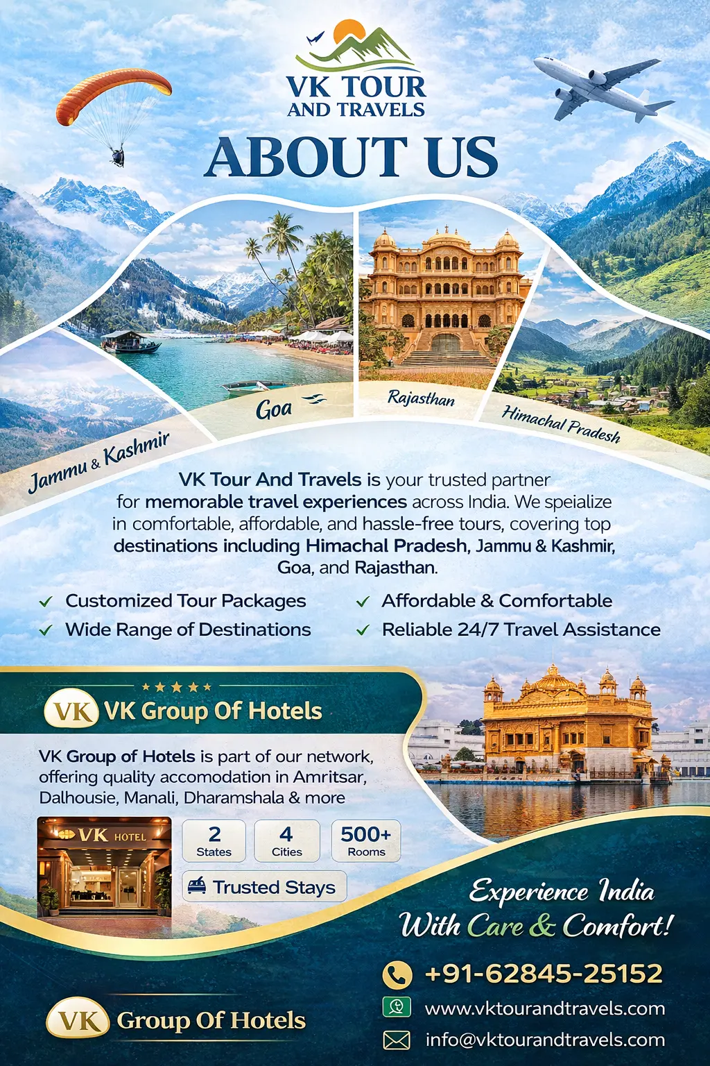 Adding more strength to our travel services, VK Group of Hotels is also part of our hospitality network. VK Group of Hotels presents its presence across Amritsar, Dalhousie, Manali, and Dharamshala, with the brand describing itself as headquartered in Amritsar and offering budget-friendly stays with quality service. The site also highlights a footprint of 2 states, 4 cities, and 500+ rooms. This hospitality connection helps us offer our guests better stay options, trusted accommodation support, and a more complete travel experience.